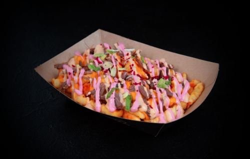 لحم البريسكت المدخن لمدة تصل إلى 12 ساعة بالإضافة إلى صوص الجبنة - ماي صوص - صوص الثوم - البصل الأخضر والبطاطس المقلية
