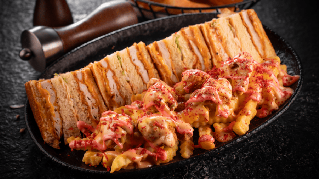 Box contains zinger sandwich on toast, plus French fries with chicken pieces and sauce