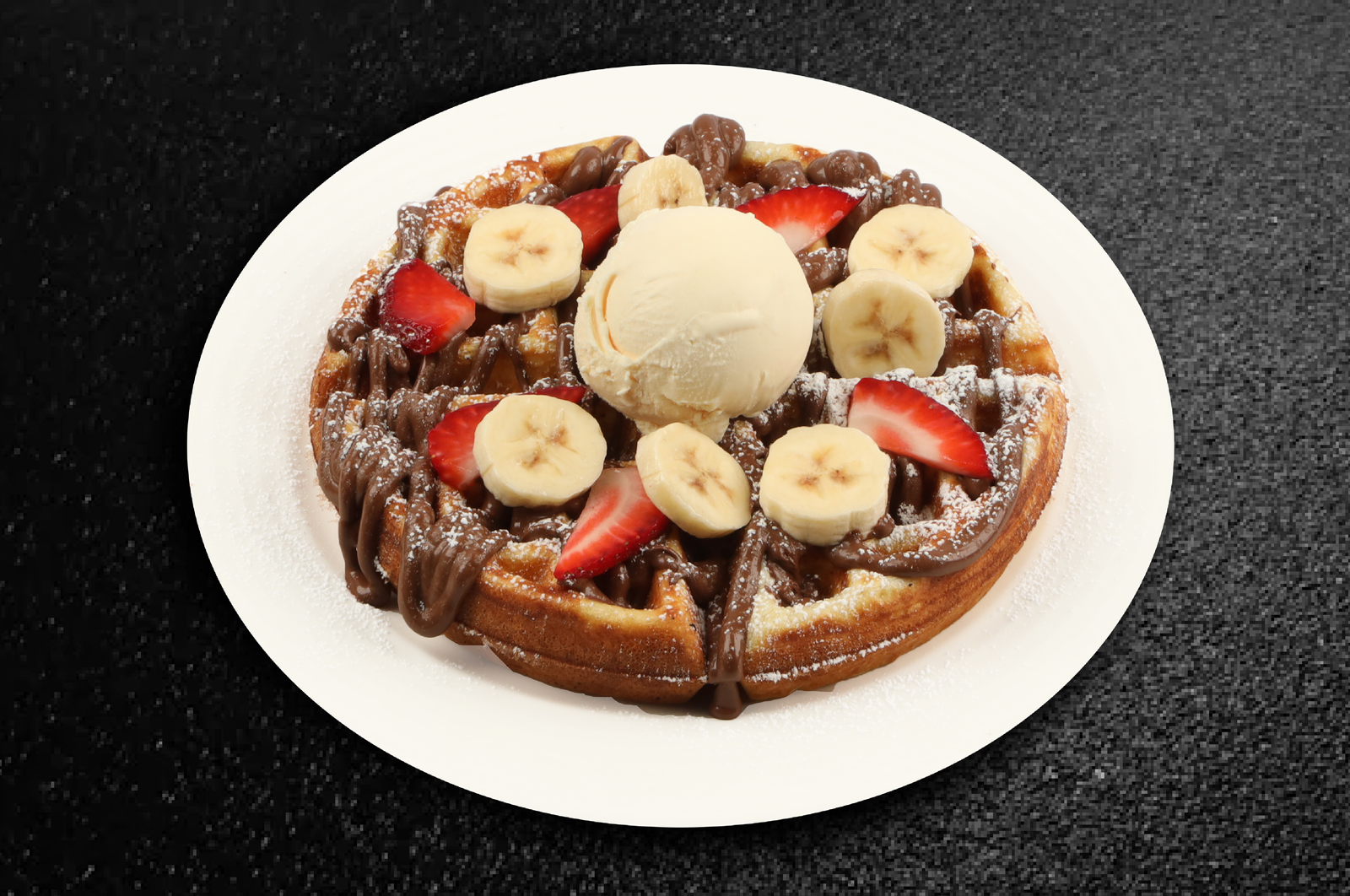 قطع الوافل الهشّة مع الآيس كريم الغني بالنكهة وحبات الفراولة الطازجة مع قطع الموز الحلوة والفستق المقرمش